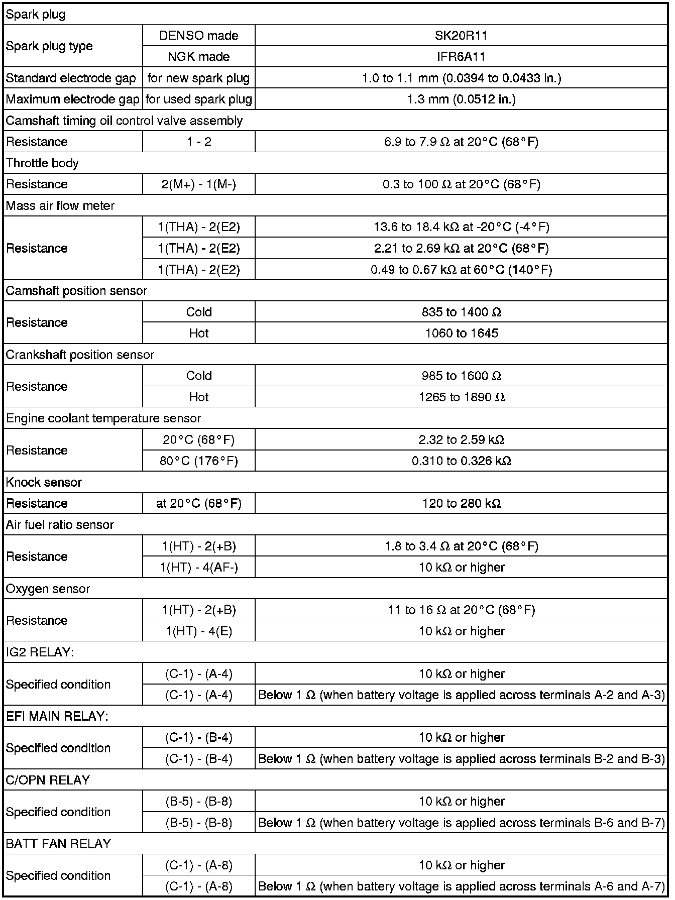 SPECIFICATIONS: 2AZ-FXE ENGINE CONTROL: SERVICE DATA