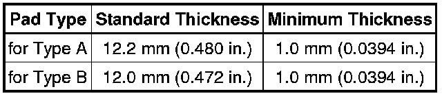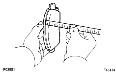 If the pad lining thickness is less than the minimum, replace the brake pads.