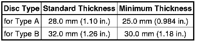 (c) If the runout exceeds the maximum value, change the installation positions of the disc and axle so that the runout will become minimal. If the runout exceeds the maximum even when the installation positions are changed, check the bearing play in the axial direction and the axle hub runout Front Axle Hub. If the bearing play and the axle hub runout are normal and if the disc thickness is not within the specified range, grind the disc. If the disc thickness is less than the minimum, replace the disc.