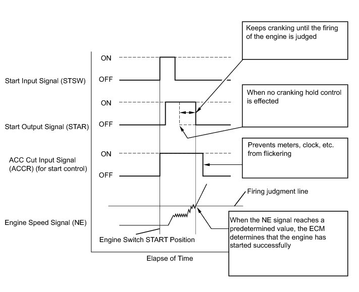 The cranking holding control system provides current to the starter when the ECM detects the engine switch's start signal (STSW). When the ECM performs a firing judgment, the system cuts current to the starter. When an ECM receives the STSW signal, it turns on the ST CUT relay, which prevents flickering of the combination meter, clock, audio system, etc. Also, the ECM sends a signal to the ECM's STAR terminal. Then the STAR output signal travels through the park/neutral position (PNP) switch (A/T) or clutch pedal switch (M/T) to the STARTER relay, causing the starter to activate.