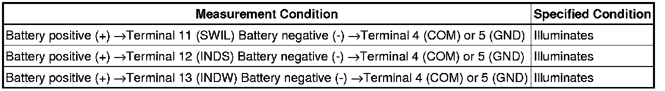 (b) Apply battery voltage between the terminals of the switch, and check the illumination condition of the switch.