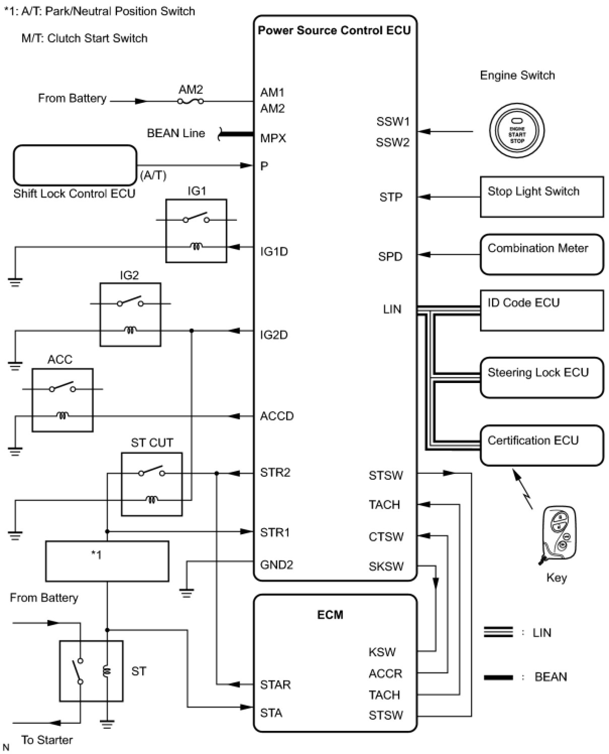 (a) A/T Models: If the engine switch is pressed with the shift lever in P or N and the brake pedal depressed, the power source control ECU determines that it is an engine start request.
