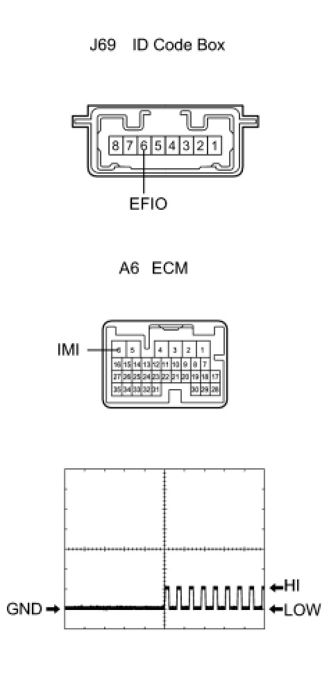 (1) Connect the oscilloscope to the terminals J69-6 (EFIO) and A6-6 (IMI).