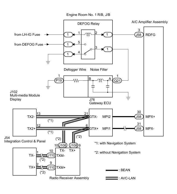 When the rear window defogger switch, which is built into the multi-media module display assembly, is operated, the operation signals are transmitted to the A/C amplifier assembly through AVC-LAN and BEAN. When the A/C amplifier assembly receives the signals, it turns on the DEFOG relay to operate the rear window defogger.