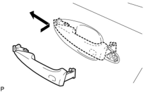(b) Insert the rear end of the rear door outside handle assembly into the rear door outside handle frame. Next slide the rear door outside handle assembly to the front of the vehicle to install it.