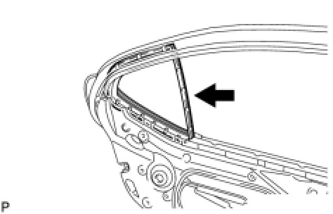 (b) Install the rear door quarter window glass together with the rear door quarter window glass weatherstrip in the direction indicated by the arrow in the illustration.
