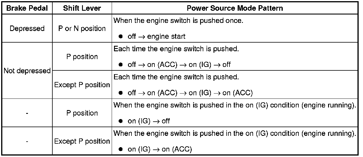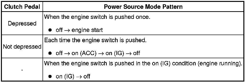 (h) After the buzzer sounds, if the engine switch is pressed within 5 seconds with the brake pedal not depressed (A/T) or clutch pedal not depressed (M/T), the power source mode changes to on (ACC) or on (IG), the same as in the normal condition.
