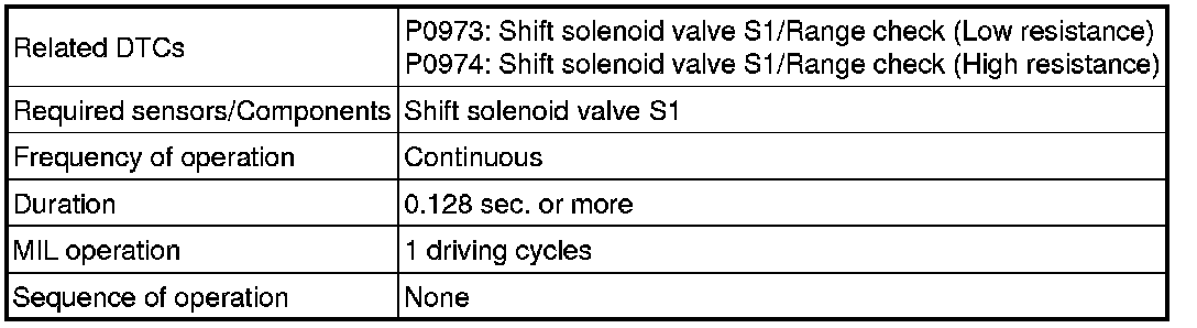 These DTCs indicate an open or short in the shift solenoid valve S1 circuit. When there is an open or short circuit in any shift solenoid valve circuit, the ECM detects the problem and illuminates the MIL and stores the DTC. When the shift solenoid valve S1 is on, if resistance is 8 Ohms or less, the ECM determines there is a short in the shift solenoid valve S1 circuit.