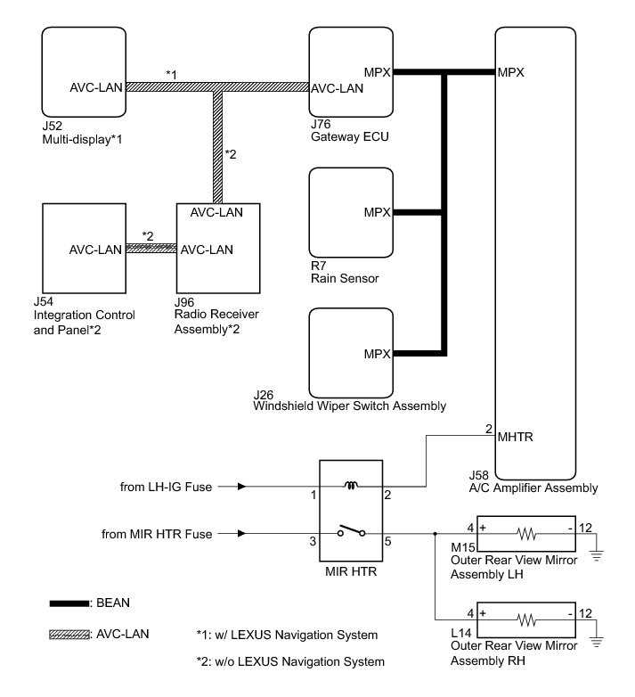 When the window defogger switch, which is built into the multi-display assembly*1 or integration control and panel*2, is operated, the operation signals are transmitted to the A/C amplifier assembly through AVC-LAN and BEAN. When the A/C amplifier assembly receives the signals, it turns on the MIR HTR relay to operate the mirror heater. When the defogger switch is turned off, the mirror heater also turns off simultaneously.