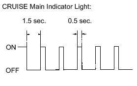 While driving with cruise control, the ECM activates AUTO CANCEL of the cruise control system when a malfunction occurs in one of the following: vehicle speed sensors, stop light switch assembly, or other related parts. When AUTO CANCEL is activated, the CRUISE main indicator light outputs the blinking pattern shown to the left. At the same time, data of the malfunction is stored as a DTC.