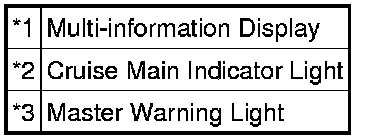 (a) The diagnosis function makes the master warning light and the multi-information display come on, and the cruise main indicator light blinks as shown in the illustration. When a malfunction occurs in the dynamic radar cruise control system, the DTCs are stored in the ECM.