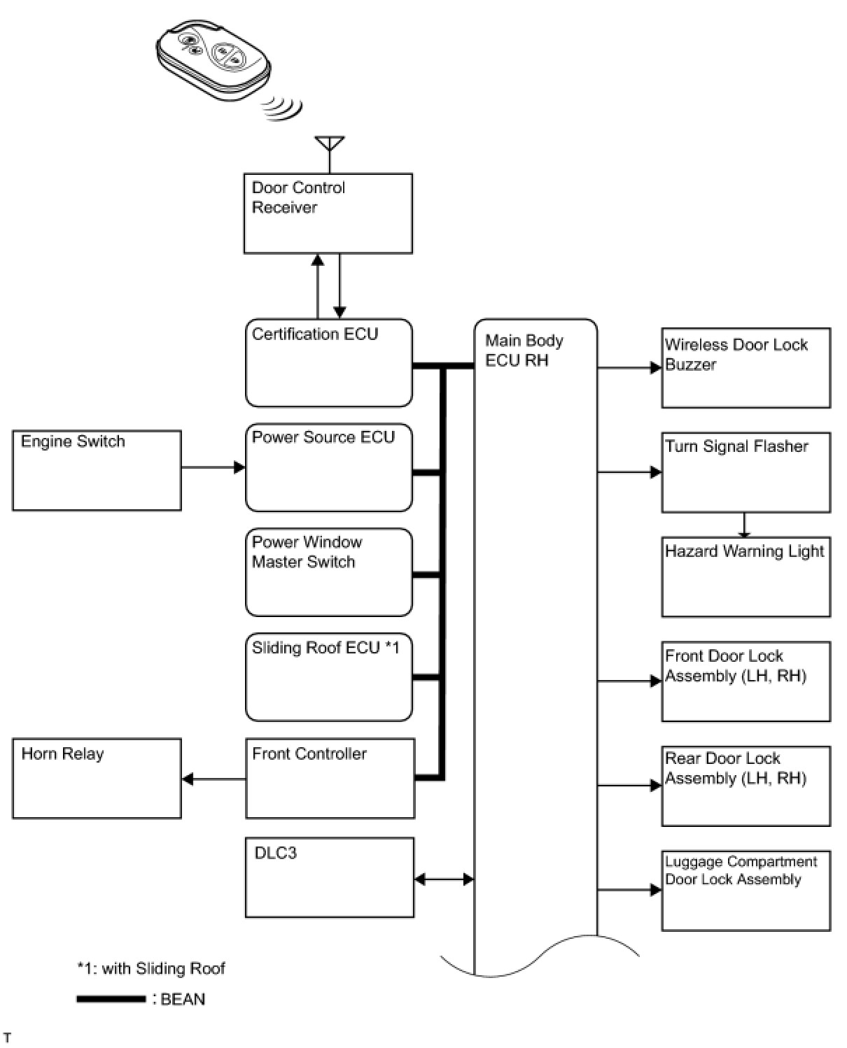 The wireless door lock control system functions to lock and unlock all the doors from a distance. The system is controlled by a hand-held transmitter which sends radio waves to the door control receiver. The main body ECU RH performs an ID code identification process and engages the door lock control.