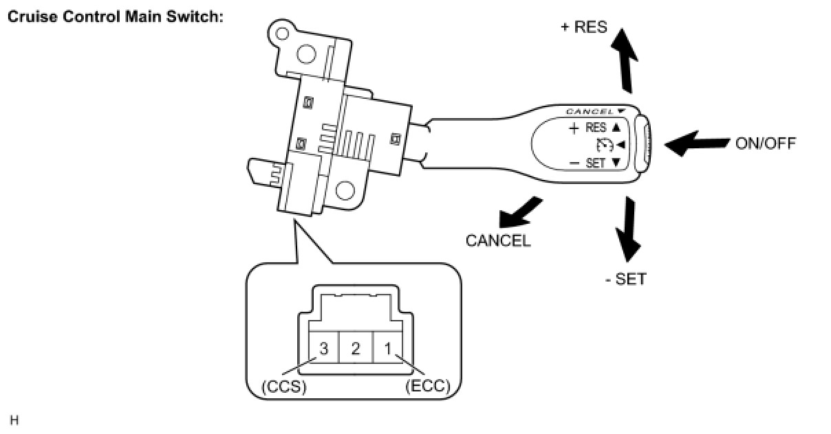 The cruise control main switch operates 7 functions: SET, - (COAST), TAP-DOWN, RES (RESUME), + (ACCEL), TAP-UP, and CANCEL. The SET, TAP-DOWN, and - (COAST) functions, and the RES (RESUME), TAP-UP, and + (ACCEL) functions are operated with the same switch. The cruise control main switch is an automatic return type switch which turns on only while operating it in the direction of each arrow and turns off after releasing it. The internal contact point of the cruise control main switch is turned on with the switch operation. Then the ECM reads the voltage value that has been changed by the switch operation to control SET, - (COAST), RES (RESUME), + (ACCEL), and CANCEL.