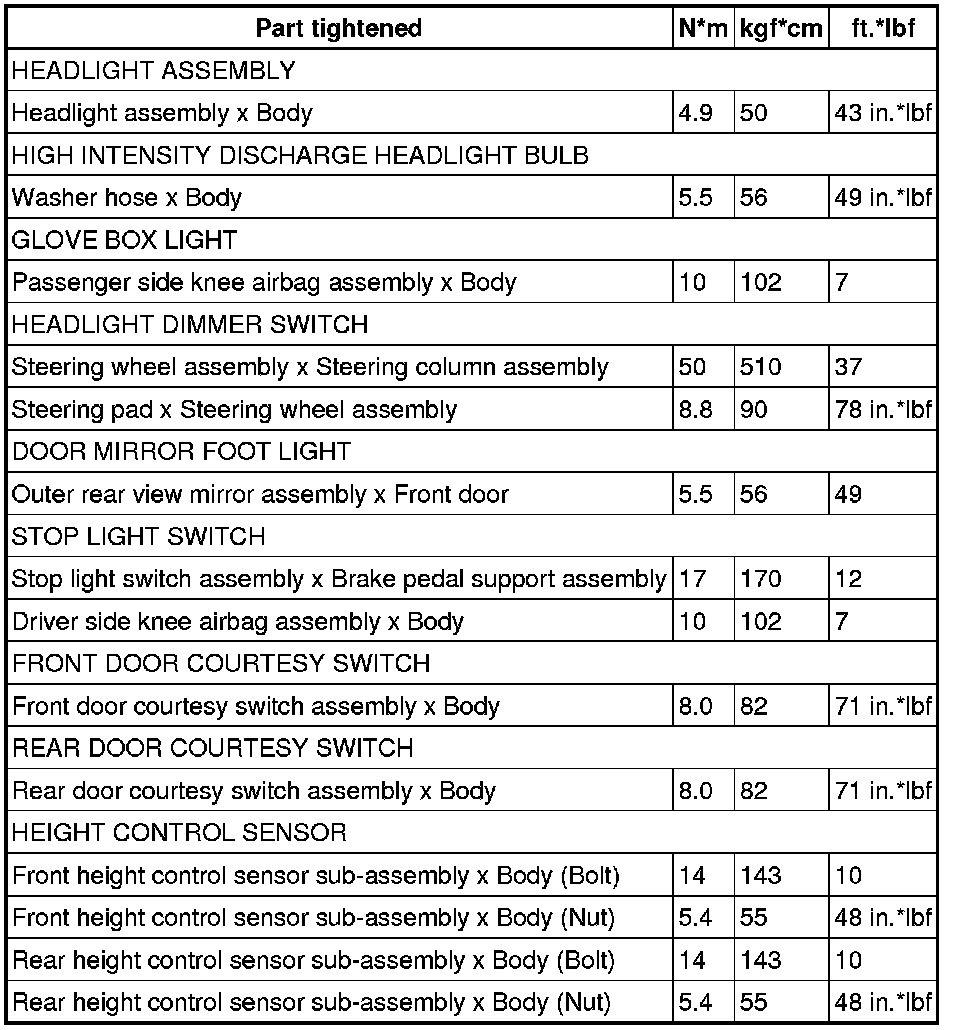 SERVICE SPECIFICATIONS: LIGHTING: TORQUE SPECIFICATIONS
