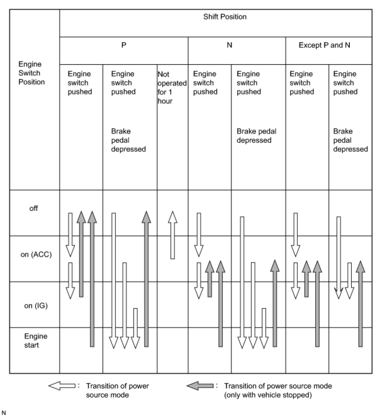 (a) A/T Models: This system has different power source mode patterns depending on the brake pedal condition and shift lever position.