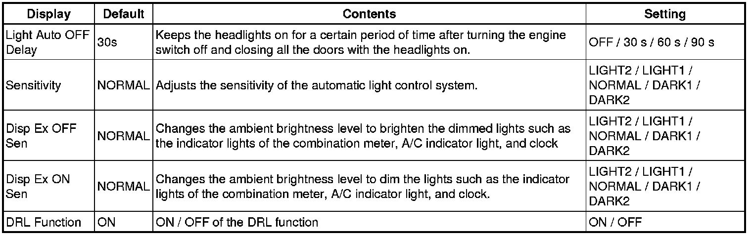 The buzzer ON/OFF setting, which is a setting of the buzzer function of the combination meter, can disable the driver and front passenger side seat belt buzzers.