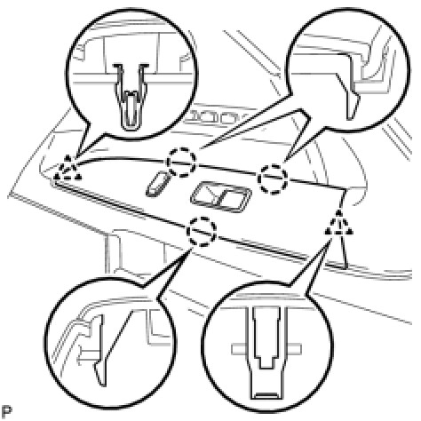 (2) Engage the 3 claws and 2 clips and install the power window regulator switch assembly with front door armrest base panel.