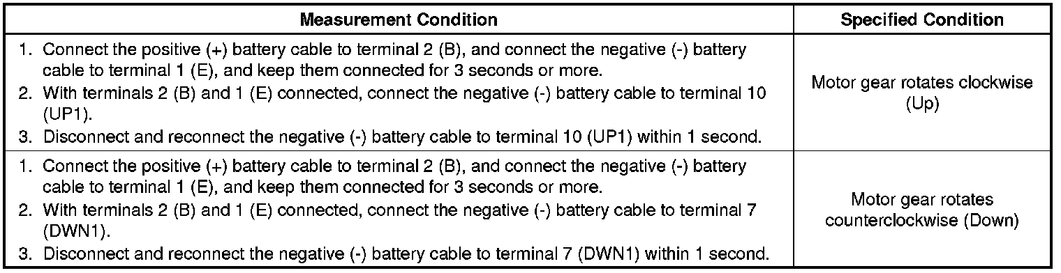 (b) Apply negative (-) battery voltage to connector terminals 1 (E) and 7 (DWN1) or 10 (UP1).