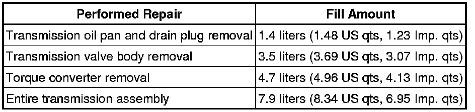 (a) Fill the transmission with the correct amount of fluid as listed in the table below.