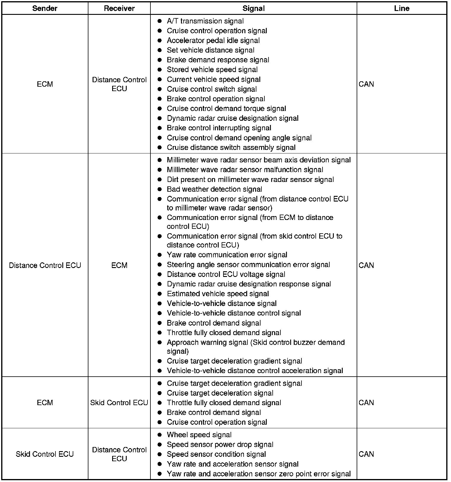 (e) In vehicle-to-vehicle distance control mode, the dynamic radar cruise control system receives signals from the yaw rate and acceleration sensor and the steering angle sensor. Based on these signals, it then estimates curve radius and compensates for information on the preceding vehicle while turning. It can also compensate for the brake control when approaching another vehicle.