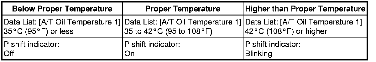 * If the fluid temperature is below 35°C (95°F), proceed to the next step. (Recommended ATF temperature 42°C (108°F) or less)
