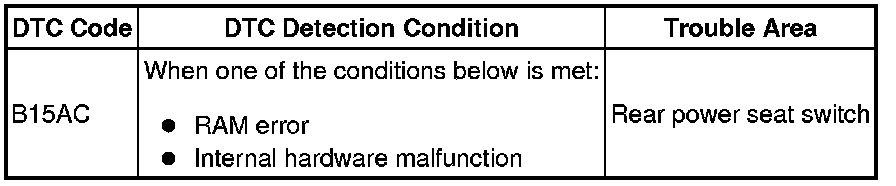 This DTC is stored when a malfunction occurs in the rear power seat switch.
