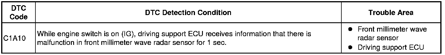 When the driving support ECU receives information that there is a malfunction in the front millimeter wave radar sensor, DTC C1A10 is output.