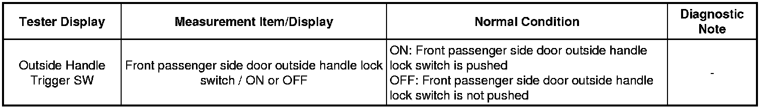 If the front passenger door entry lock function does not operate but the entry unlock operation operates, the communication line between the vehicle and electrical key transmitter is normal. Either of the following may have occurred: 1) the entry lock switch is malfunctioning; or 2) the front door ECU RH receives the entry lock switch ON signal, but is unable to send the signal to the certification ECU through CAN communication.