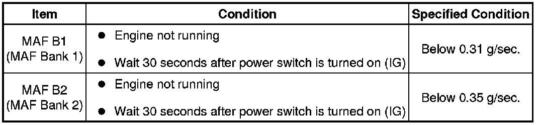 (3) Enter the following menus: Powertrain / Engine and ECT / Data List / All Data / MAF Bank 1 or MAF Bank 2.
