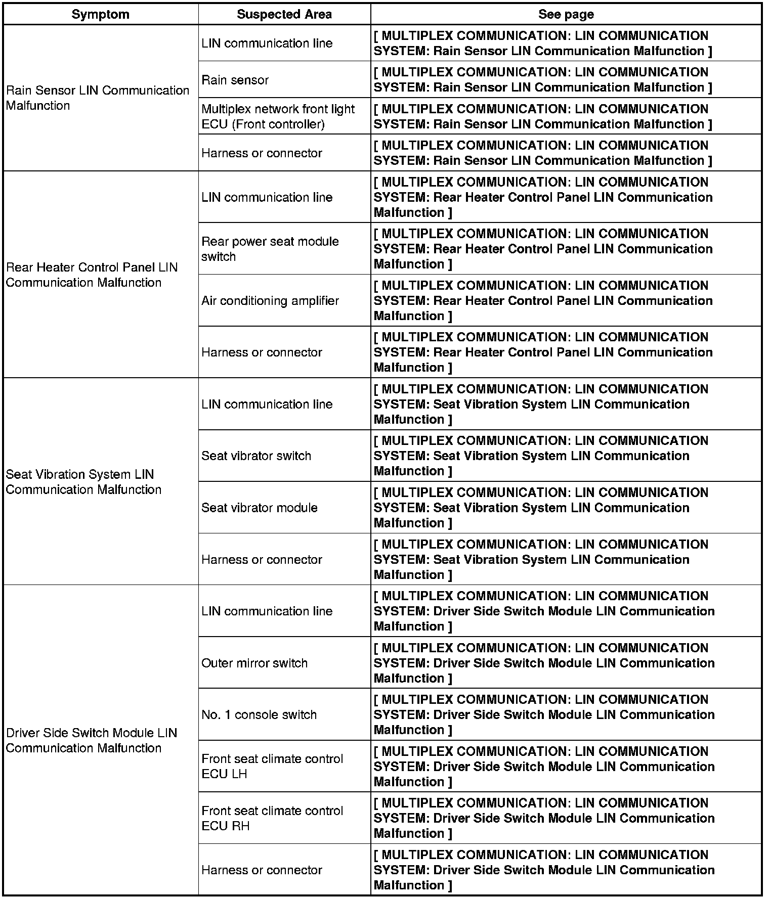 MULTIPLEX COMMUNICATION: LIN COMMUNICATION SYSTEM: PROBLEM SYMPTOMS TABLE