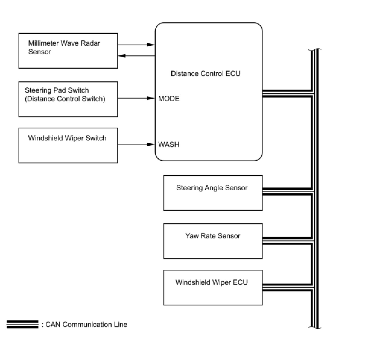 (d) The millimeter wave radar sensor and the distance control ECU control the system while the vehicle-to-vehicle distance control mode is in operation, and send signals to each actuator and ECU.