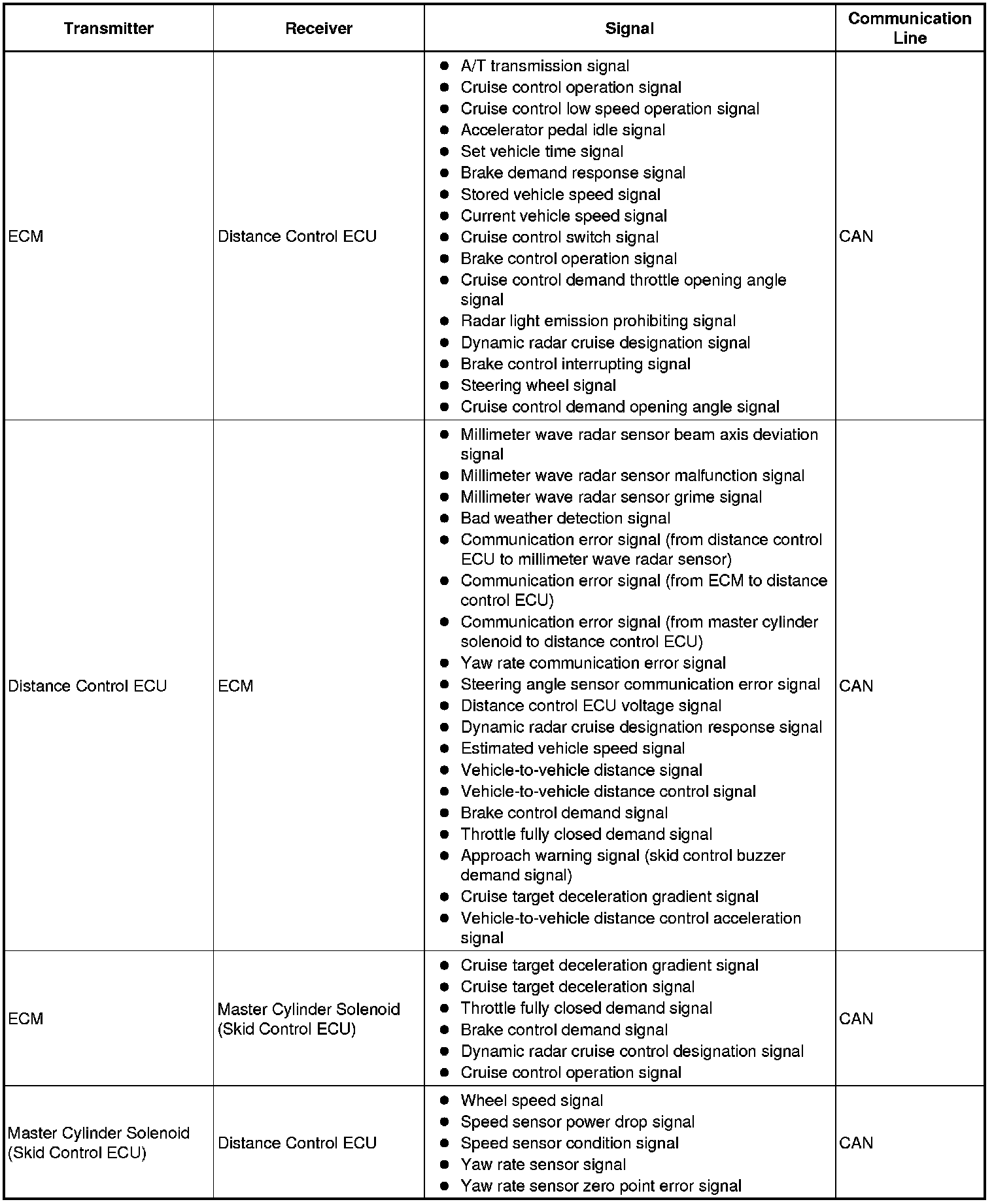 The distance control ECU determines the distance to the vehicle in front, relative speed, target decreasing speed and deceleration rate. Based on the data, the ECU may transmit a brake demand signal to the master cylinder solenoid (skid control ECU) via the ECM.