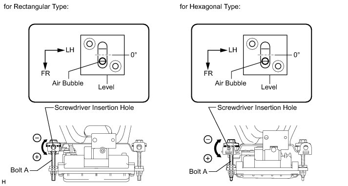 (3) Using a screwdriver, adjust the sensor by turning the vertical adjusting bolt of the millimeter wave radar sensor assembly (bolt A) until the air bubble is centered on the red line of the level as shown in the illustration.
