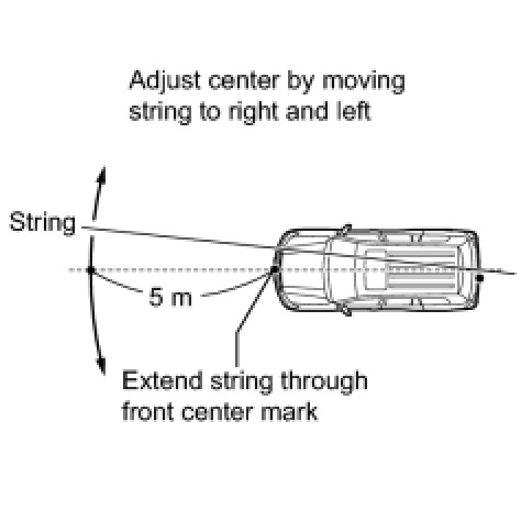 Affix one end of a string to the rear center point mark and extend the string 5 m (16.4 ft.) from the front of the vehicle. Move the other end of the string left and right to align the string with the front center point mark and make a straight line.