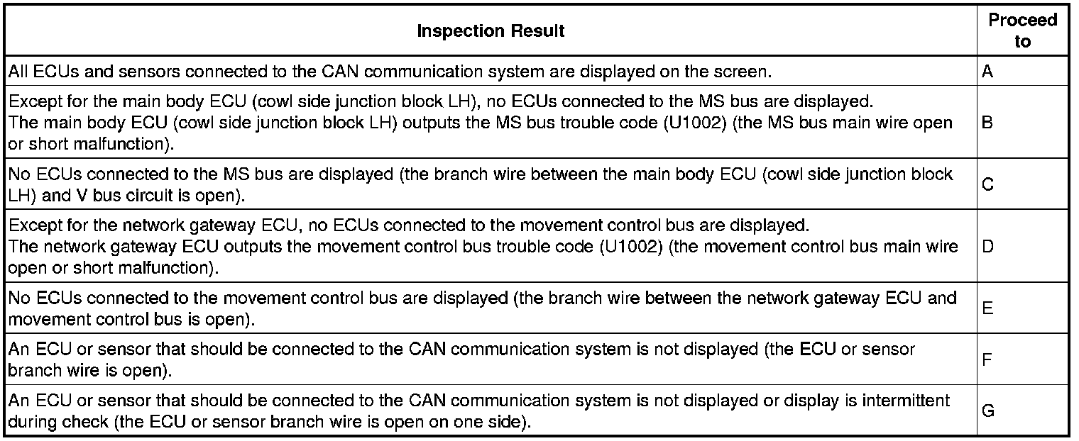 * The gateway ECU built into the main body ECU (cowl side junction block LH) may be malfunctioning if both of the following occurs: 1) all ECUs connected to the MS bus are not displayed on the Techstream; and 2) DTC U1002 is not output.