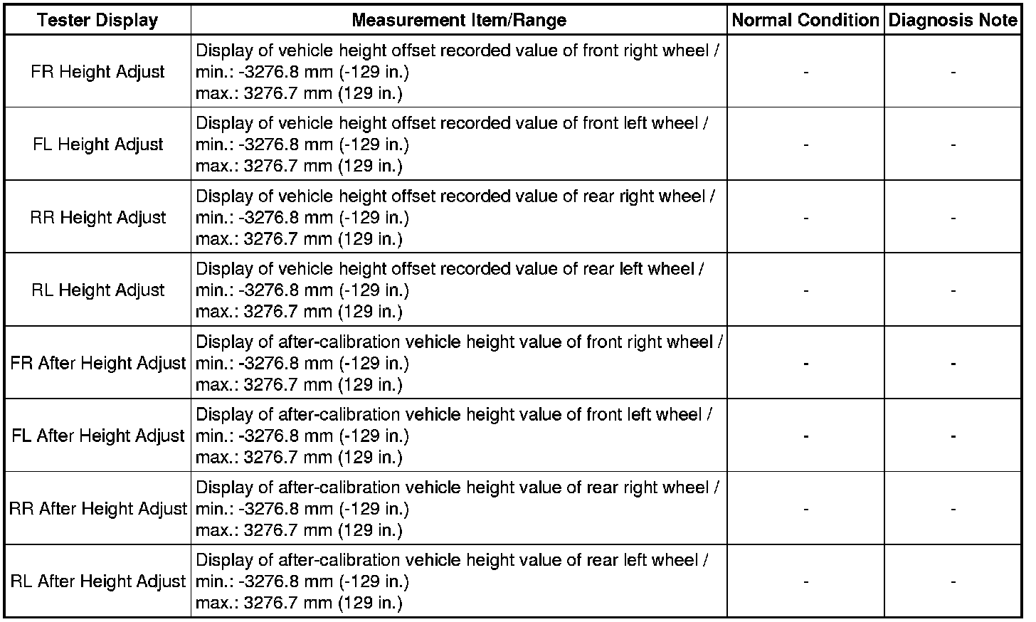 The possible vehicle height automatic adjustment value is 20 mm (0.787 in.). If the "Height Adjust value + (Standard value - Measurement value - After Height Adjust value)" is 20 mm (0.787 in.) or more, first perform the vehicle height adjustment for the front side, and for the rear side.