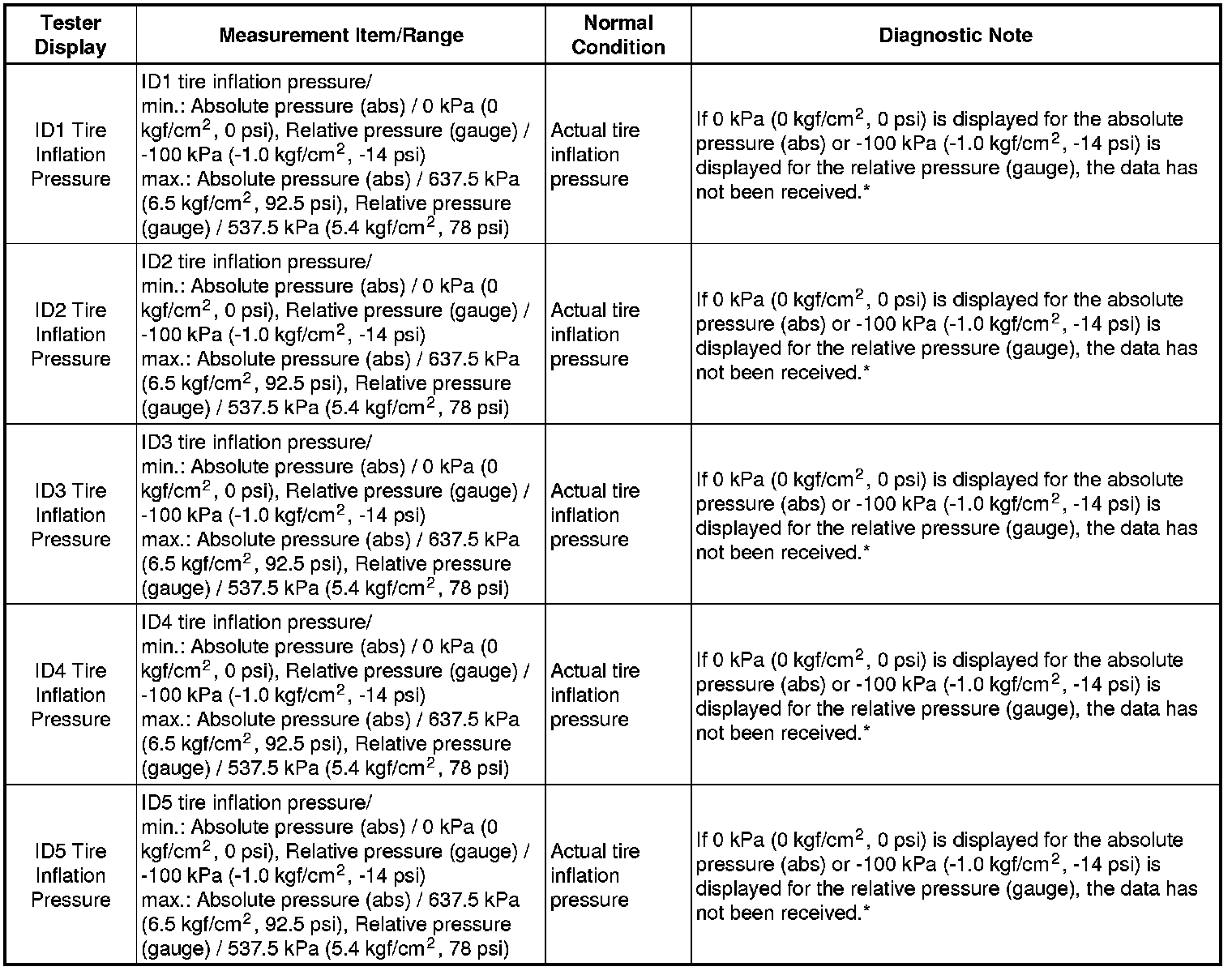 * The initialization is complete when the Data List "ID Tire Inflation Pressure" display shows the correct pressures.