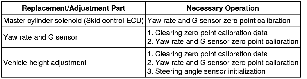 After replacing the master cylinder solenoid and/or yaw rate and G sensor or performing a vehicle height adjustment, make sure to perform yaw rate and G sensor zero point calibration.