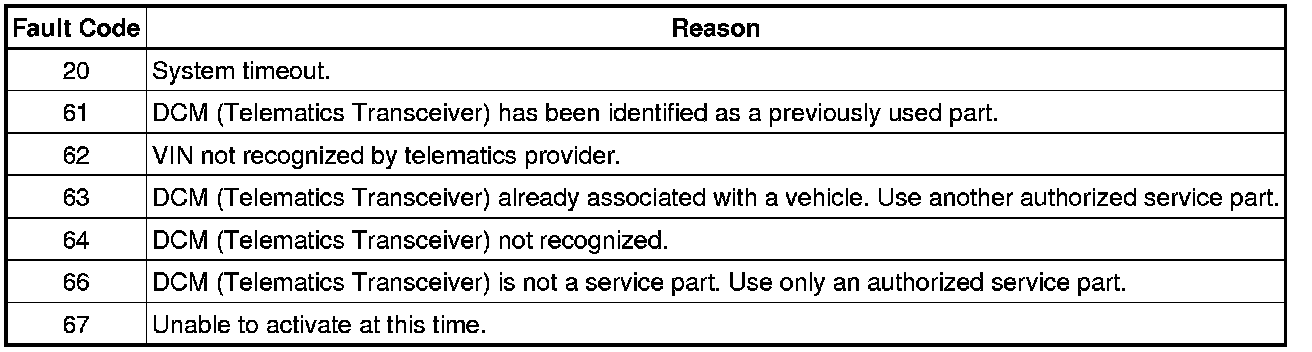 * Fault 61: Replace the DCM (Telematics Transceiver) with a new service part and perform DCM Activation.