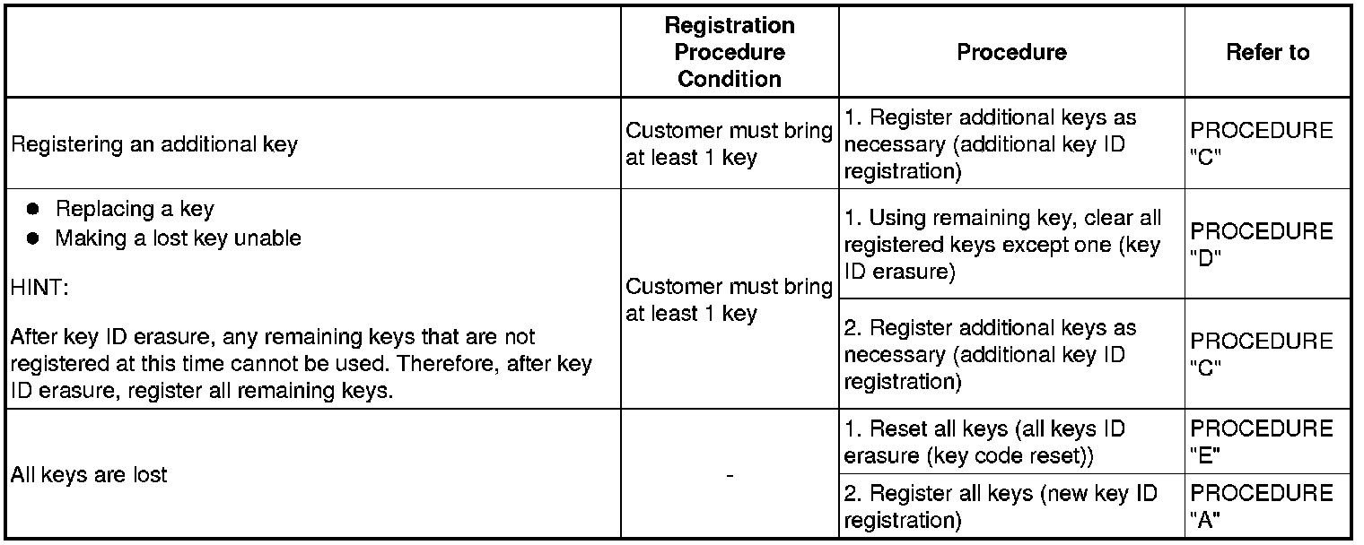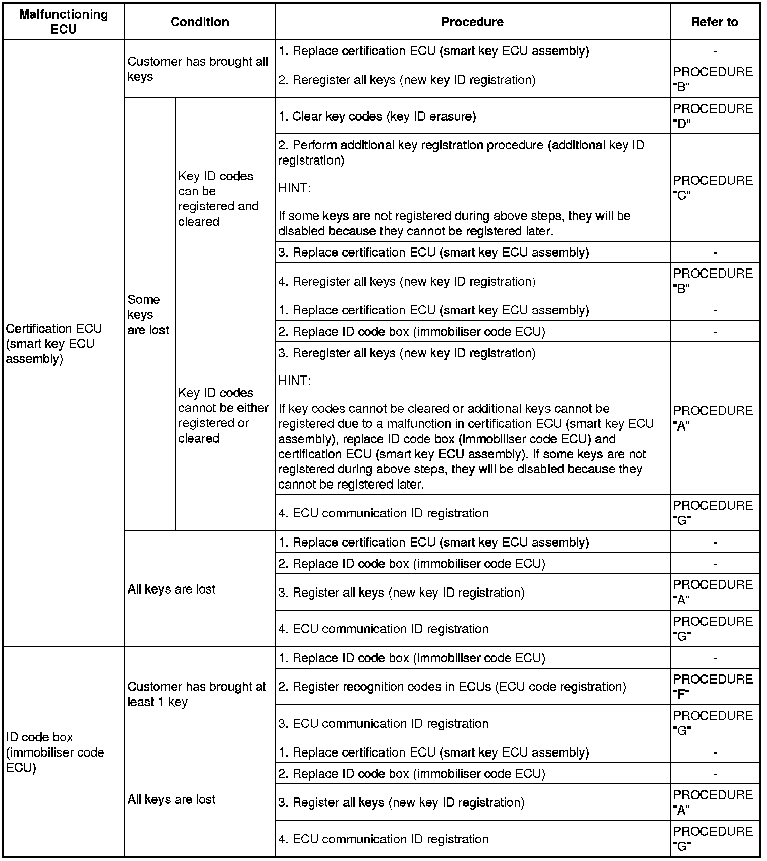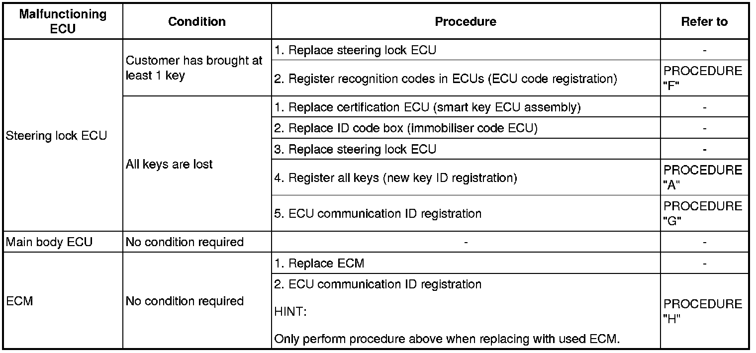(1) If a malfunctioning ECU is discovered through troubleshooting of the smart key system, use the ECU replacement and key registration procedures in the table below.