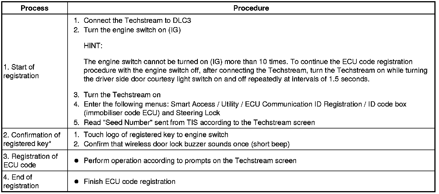 *: Perform this process for one of the keys registered to the vehicle. Finish the procedure within 30 seconds. If the procedure has not been finished within the specified time, perform the registration from process 1 again.