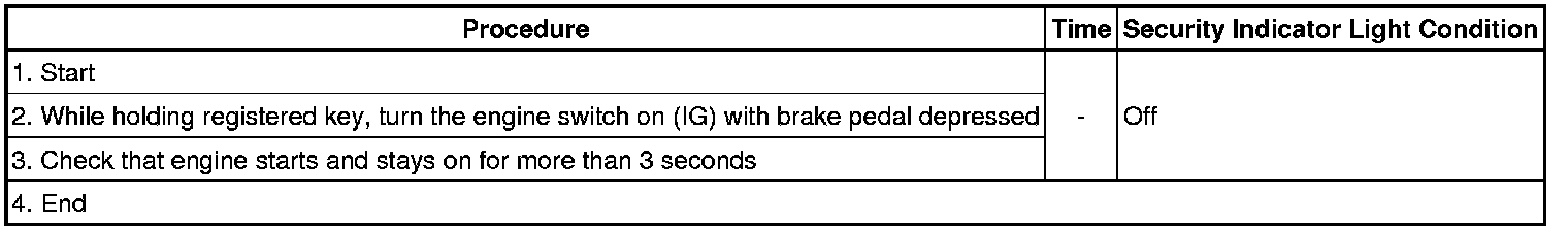 * *1: Repeat this process for each key registered to the vehicle. Finish the procedure for each key within 30 seconds. If the procedure for any of the keys has not been finished within the specified time, perform the registration from process 1 again. When performing the key confirmation procedure for a key, the security indicator light comes on and remains on until all the keys are confirmed.