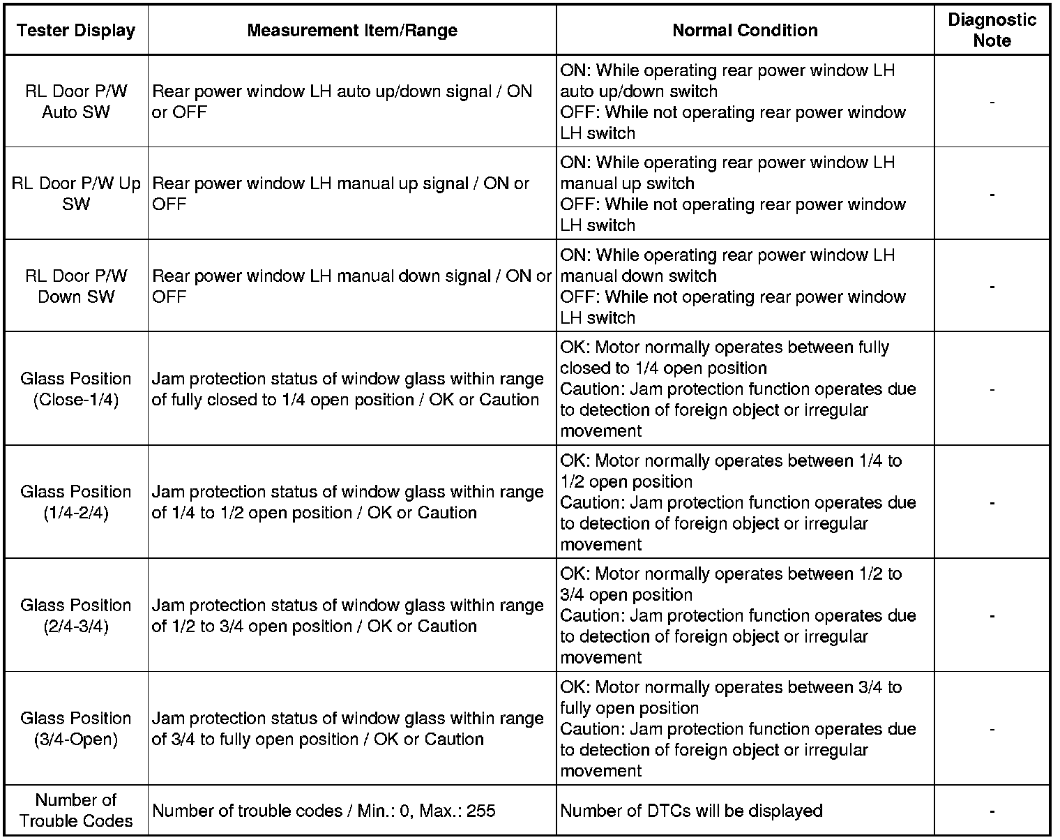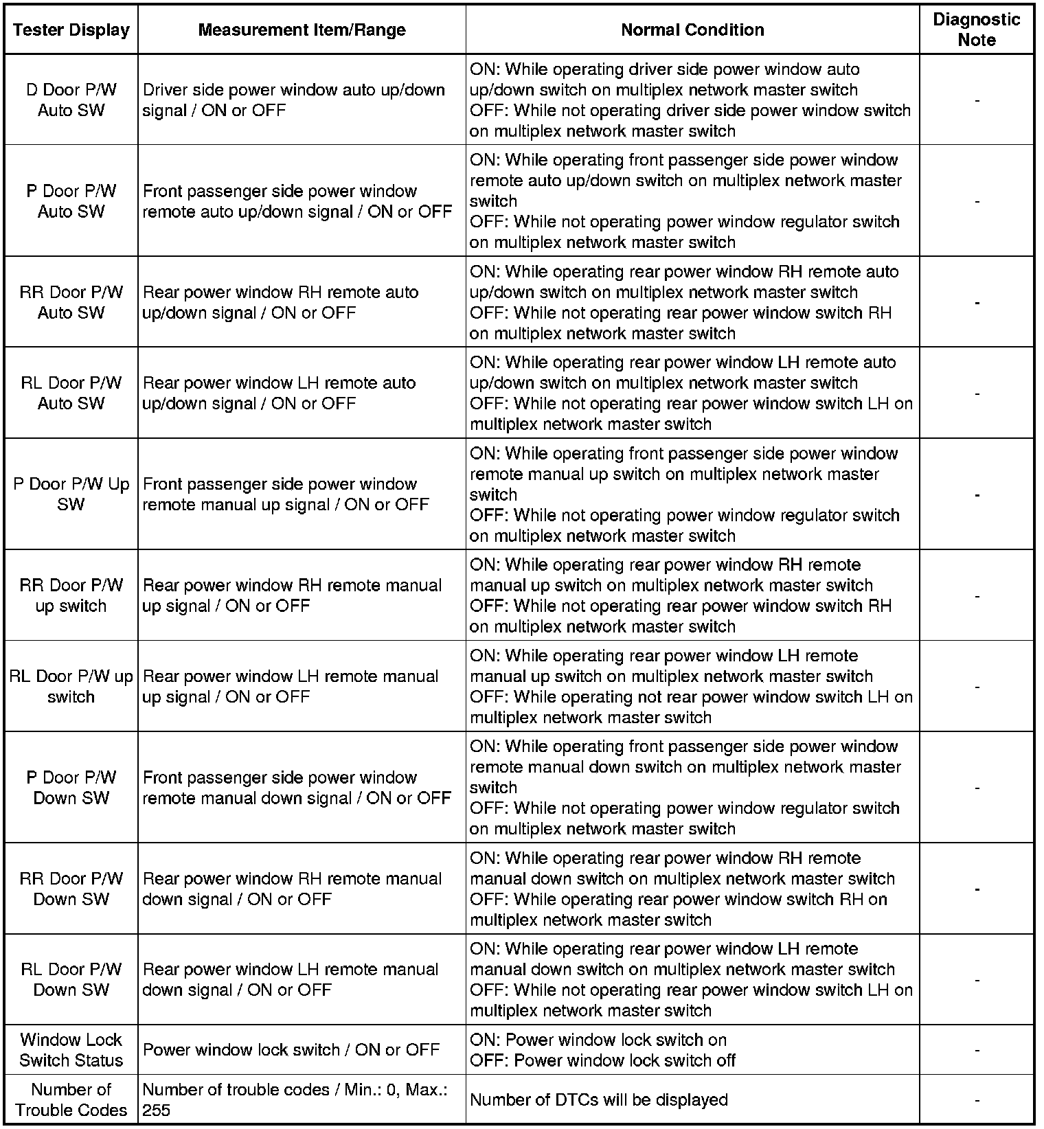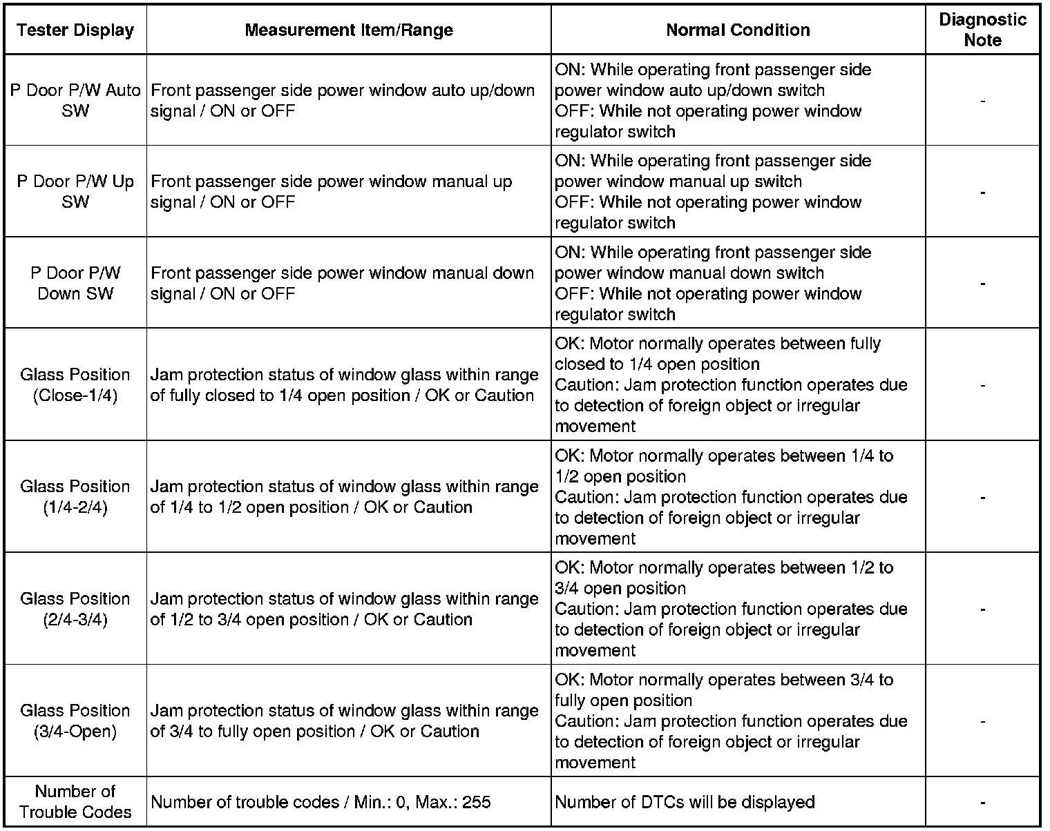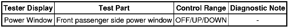 WINDOW / GLASS: POWER WINDOW CONTROL SYSTEM: DATA LIST / ACTIVE TEST
