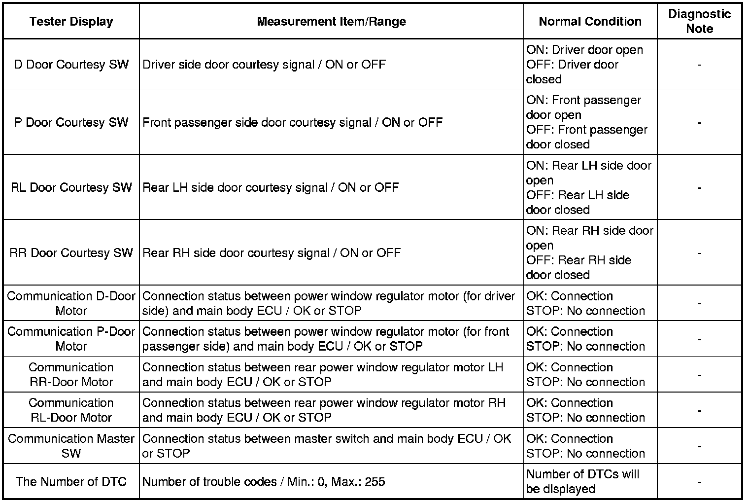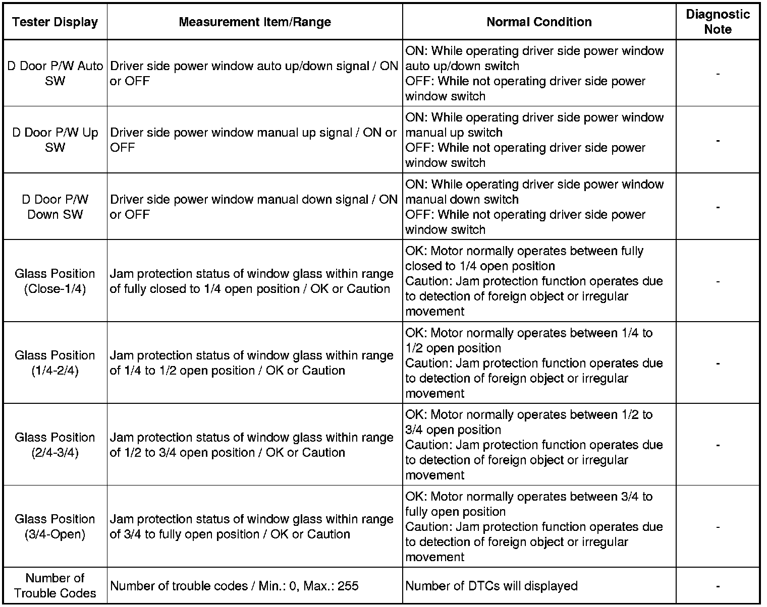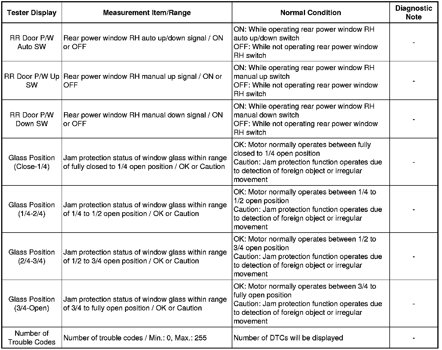 WINDOW / GLASS: POWER WINDOW CONTROL SYSTEM: DATA LIST / ACTIVE TEST