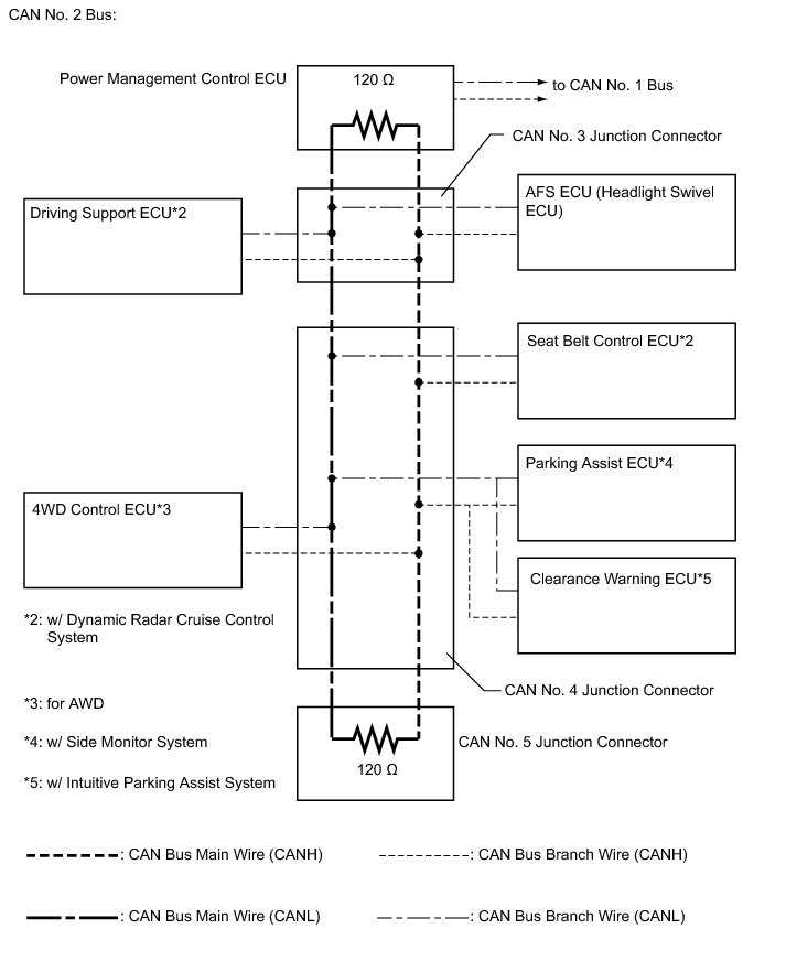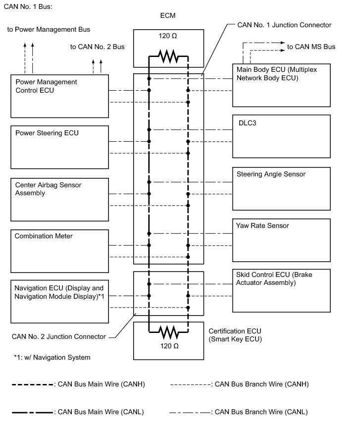 The HS-CAN bus is a high speed communication bus that is used for powertrain, chassis and some body electrical communication. The HS-CAN bus is referred to as "CAN No. 1 bus", "CAN No. 2 bus" and "power management bus" and it operates at speeds of approximately 500 kbps. Terminating resistors for the CAN No. 1 bus are located in the certification ECU and ECM. Terminating resistors for the CAN No. 2 bus are located in the power management control ECU and CAN No. 5 junction connector. Terminating resistors for the power management bus are located in the power management control ECU and ECM. The resistance of the CAN No. 2 bus and power management bus cannot be measured from the DLC3 connector.