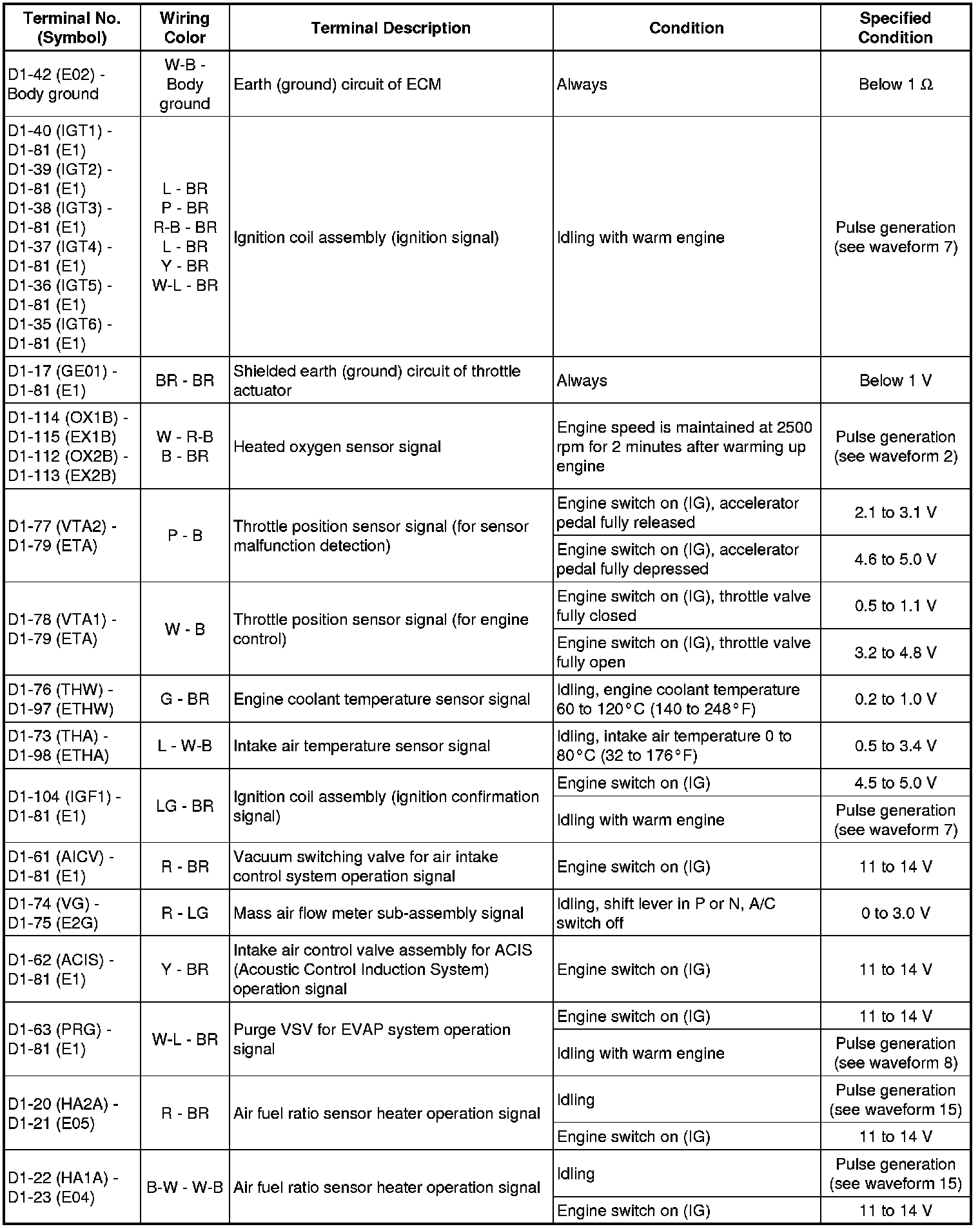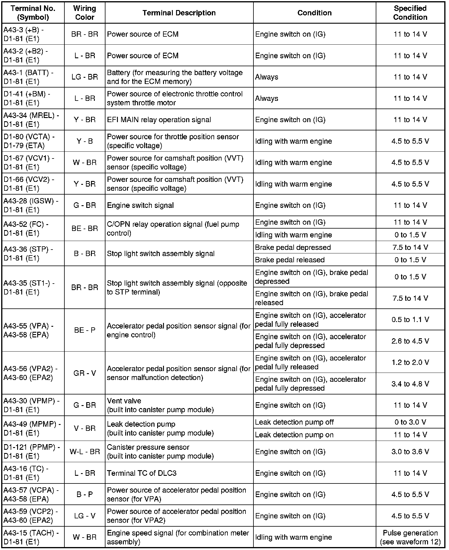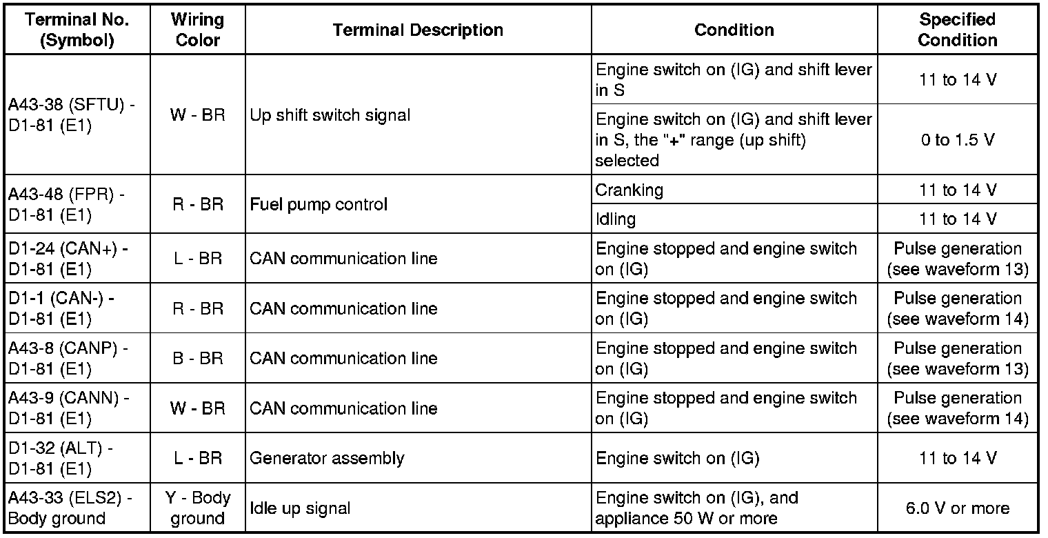 The standard normal voltage between each pair of the ECM terminals is shown in the table below. The appropriate conditions for checking each pair of the terminals are also indicated.