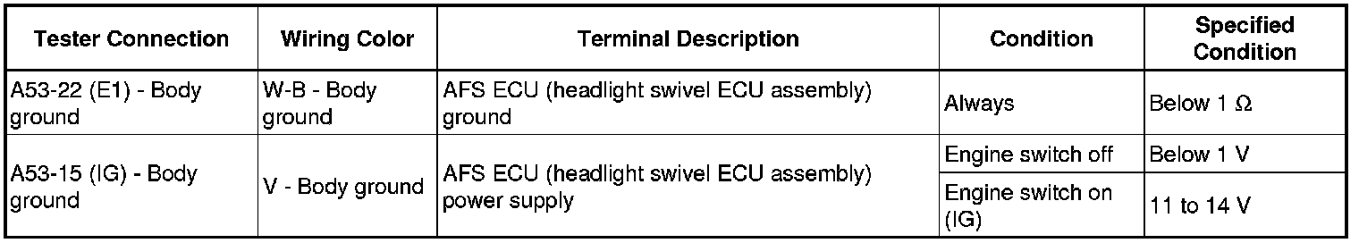 If the result is not as specified, the AFS ECU (headlight swivel ECU assembly) may be malfunctioning.