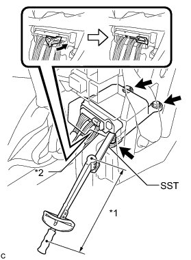 (c) Using SST and a torque wrench, install the center airbag sensor assembly with the 3 bolts.