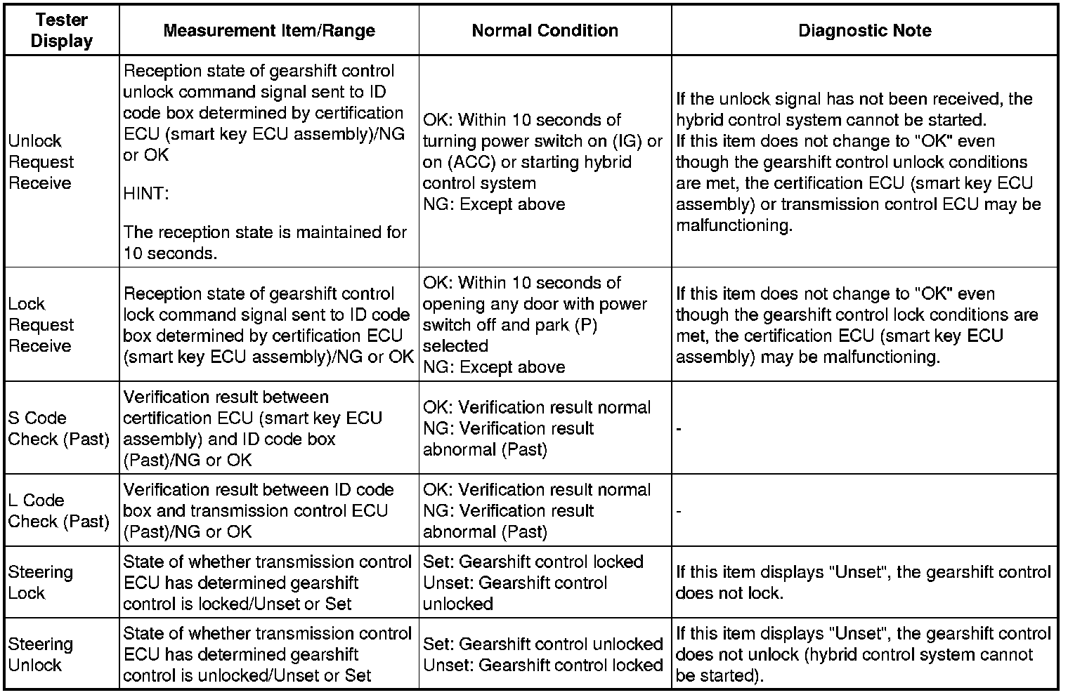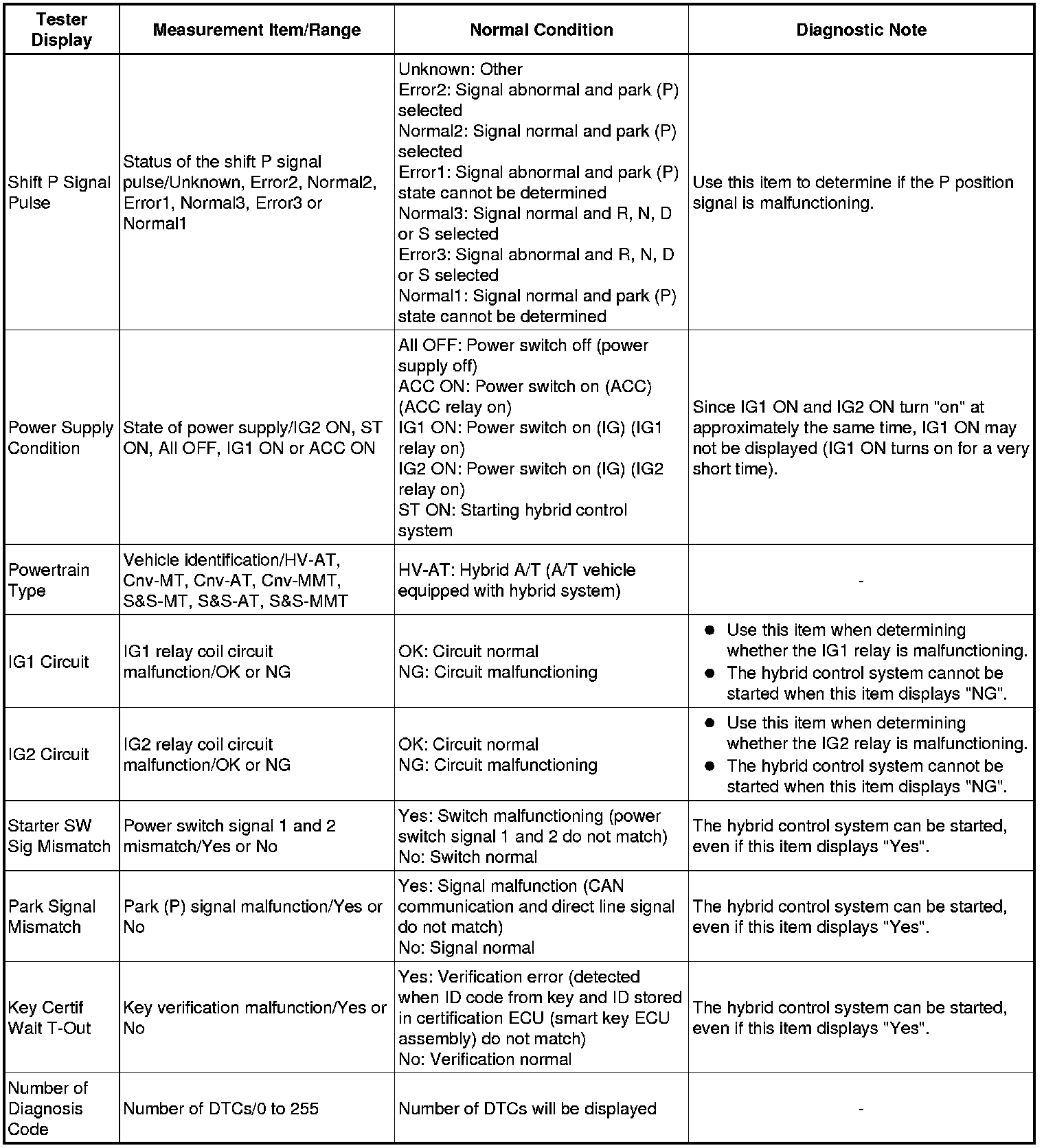 Using the Techstream to read the Data List allows the values or states of switches, sensors, actuators and other items to be read without removing any parts. This non-intrusive inspection can be very useful because intermittent conditions or signals may be discovered before parts or wiring is disturbed. Reading the Data List information early in troubleshooting is one way to save diagnostic time.