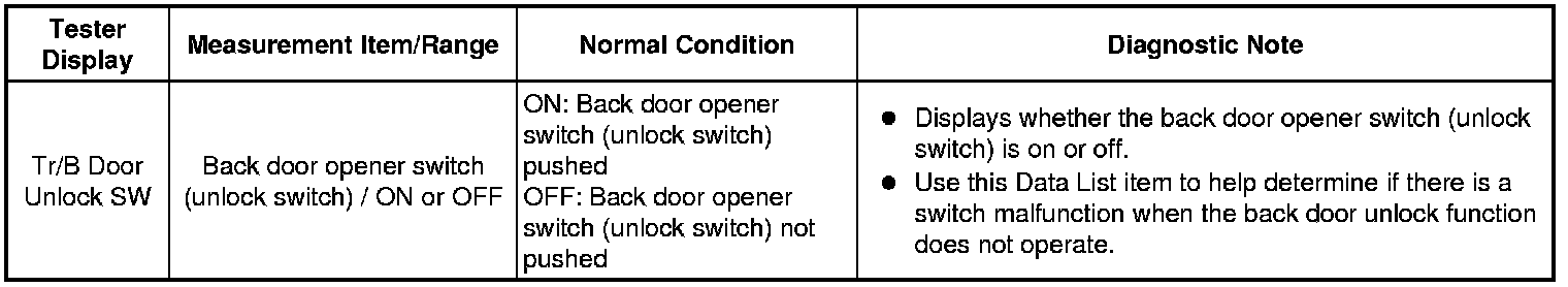 If the entry unlock function does not operate for the back door only, but the entry lock function operates, the request code is being transmitted properly from the back door. In this case, there may be a problem related to the unlock switch (connection between the back door opener switch assembly and certification ECU (smart key ECU assembly)).